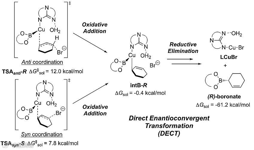 铜催化的烯丙基硼化反应与传统钯催化的烯丙基化反应不同,通常采取立体选择性的SN2'亲核进攻机理,而不经历η3-烯丙基金属配合物中间体这一去不对称化过程。γ-取代的烯丙基卤代烃可以方便快捷地由各种烯丙醇通过氢卤化反应制得,为制备含有手性季碳中心的烯丙基硼酸酯提供可能性。然而,该方法面临两大挑战:(1)如果催化剂不能提供高效的动力学控制,外消旋的底物对映异构体将通过平行反应得到外消旋产物,而无法实现对映选择性;(2)烯丙基溴化物自身会在酸或金属作用下发生快速的消旋化与烯丙位异构化,会对催化硼化反应过程中的立体选择性产生干扰。通过控制实验、配合物单晶衍射分析并结合DFT理论计算,陈俊丰课题组发现在碱性条件下手性胍可以与亚铜形成高亲核活性的硼基铜酸盐阴离子。该阴离子型配合物分别与R构型与S构型烯丙基溴通过anti-coordination和syn-coordination两种不同途径,得到相同的氧化加成中间体,最终生成具有单一光学活性的烯丙基硼酸酯。该反应不同于常见的动态动力学不对称转化过程 (DYKAT),而是采取一种特殊的直接手性汇聚转化机理 (DECT),并通过阴离子型铜胍配合物对硼化反应的加速效应,有效避免了烯丙基溴化物自身消旋化和烯丙基异构化对反应选择性的干扰。