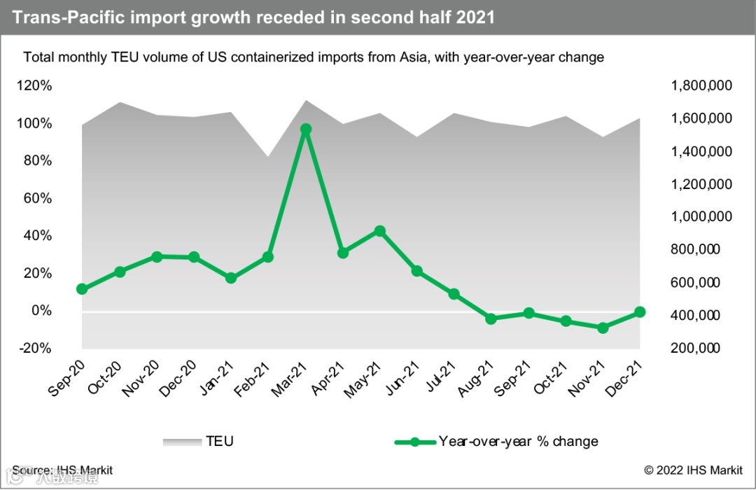 2021年,来自亚洲的集装箱进口量同比增幅稳步下降,这为供应量放缓的预测提供了依据。2021年3月,进口额比2020年3月高出97%,反映出在疫情封锁初期,全球贸易显著放缓。从去年8月开始,月度同比下降,反映出2020年底创纪录的进口,但2021年全年进口量仍比2019年大流行前高出19%以上。