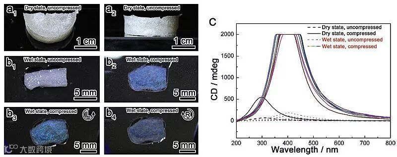 基于体系中引入了橡胶弹性体PDMS,该气凝胶体系(RPA-PDMS)在水溶液具有良好的柔韧性,其压缩/去压缩过程能够实现完全变形恢复。同时,圆二色(CD)光谱测试显示压力作用下凝胶体系的反射光呈现手性特性。
