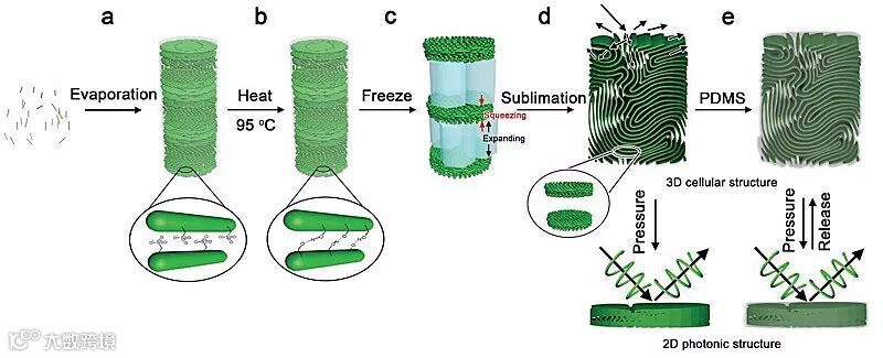 光学性质具有光、热、电场、机械等刺激响应性的光子材料在传感器件领域具有重要的应用。其中,压力刺激响应性光子材料是气压传感器、机械探针等技术领域的核心关键材料。作为一类来源广泛的天然高分子材料,纤维素纳米晶体在一定浓度条件下能够自组装形成手性向列相液晶结构,基于体系干湿态触发的材料结构变化实现材料光散射性能调控,广泛被用作显色材料。但是,目前纤维素纳米晶体基的光子材料多以2D薄膜材料的形式呈现,其机械响应性局限于螺距或胆甾体结构域倾斜角的变化。