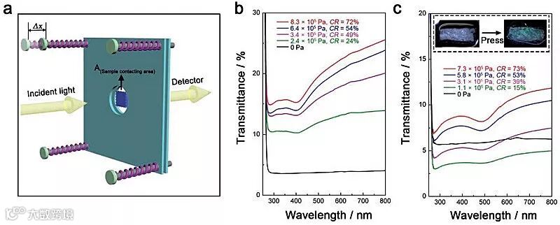 研究人员进一步采用UV-Vis光谱对不同状态下气凝胶的光学性质进行表征,相较于未压缩状态240 kPa压缩条件下气凝胶在约410 nm处呈现明显的特征峰,且峰值强度随压力的增加而增强;同时,研究表明不同极性溶剂对CNC层的溶胀度不同,从而可实现凝胶体系特征峰值以及显示颜色的进一步调控。