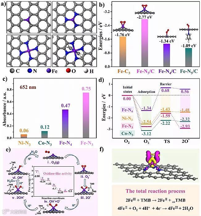 Figure 1. (a) The potential oxidase-like model with optimized structures of Fe-C3, Fe-N3/C, Fe-N4/C, and Fe-N5/C. (b) The optimized structures for O2 adsorption on Fe-C3, Fe-N3/C, Fe-N4/C, and Fe-N5/C structures and the corresponding adsorption energies. (c) The absorbance changes of oxTMB with different catalysts. (d) The free-energy diagram for the oxidase-like mechanism on different structures. (e) Optimized geometric structures of various intermediates along the oxidase-like reaction path on Fe-N/C-CNTs. (f) The calculated charge density distribution for O2 adsorption on the Fe-N/C-CNT surface. Red and yellow denote electron accumulation and electron depletion, respectively.
