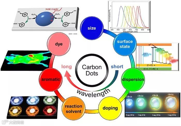 碳点(CDs)是一类具有光致发光性质的含碳纳米颗粒。由于其具有合成方法简单、成本低,良好的光学稳定性和生物相容性以及光学性质可调等优点,CDs引起了科研人员的广泛兴趣。然而绝大多数CDs的激发光和发射光波长位于蓝光区,严重制约了CDs在生物诊疗、光捕获和光催化等领域的广泛引用。因此,研究人员致力于将CDs的最佳激发光和发射光波长推向红光区或近红外光区(红色碳点)。他们通过对合成路线的合理设计和对合成条件的巧妙控制,制备了一系列新型的红色碳点,有效拓宽了CDs在各领域的广泛应用。鉴于该研究方向的飞速发展,本文综述了近年来红色碳点的发展,总结归纳了CDs光学性质的调控手段,如CDs的粒径、表面状态以及异原子掺杂、反应溶剂和碳源种类等。其中反应溶剂和碳源的种类对CDs的光学性质有重要影响。值得注意的是,以具有芳香环的有机分子和具有红色荧光的染料分子为碳源,可以进一步将CDs的最佳激发光和发射光波长调节到红光区和近红外区,这将大大拓展CDs在白光LED、生物检测、成像、诊疗以及光催化等领域的应用。最后,本文讨论了红色碳点面临的挑战及其发展前景,为设计新型高效的红色碳点提供新的思路。