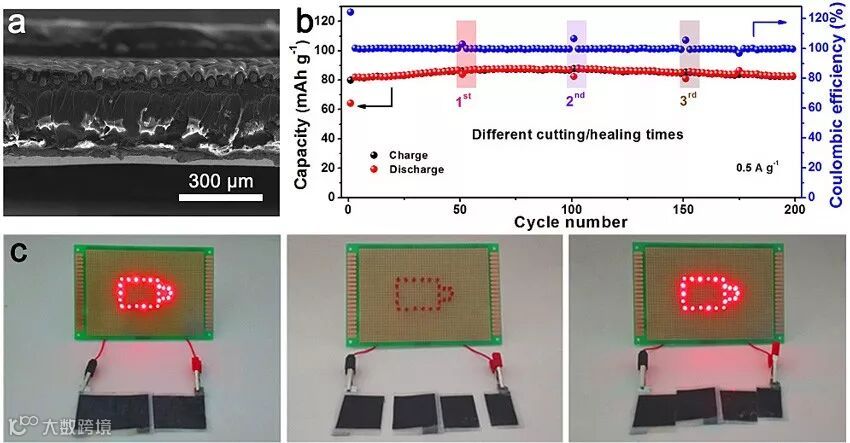 通过设计器件结构,将水凝胶电解质与正极、负极和隔膜进一步集成组装成一体化的自修复ZIBs,器件经过几次切割/修复后,可完全恢复其电化学性能。这可以有效提高自修复ZIBs的耐用性,延长电池使用寿命,减少浪费和降低成本等。本工作为防止大形变下柔性电池形变而产生破碎提供了新的解决方案,并启发了其他自主自修复电子设备的设计和制造。