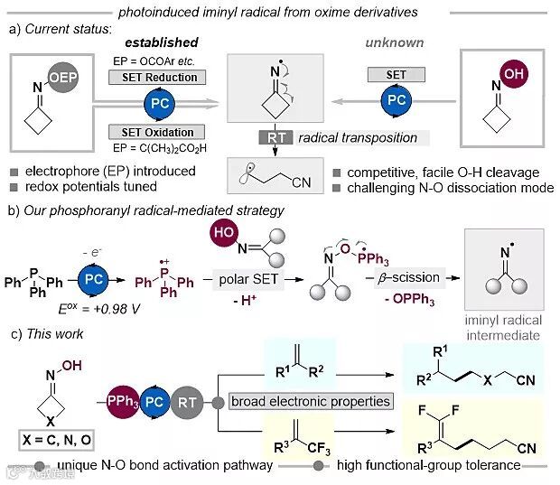 中南大学化学化工学院的阳华教授团队一直致力于可见光催化方法学的研究。在前期研究的基础上(Chem. Commun., 2019, 55, 2712; Org. Lett., 2018, 20, 1363; Org. Lett., 2017, 19, 146; Org. Chem. Front., 2018, 5, 1608; J. Org. Chem., 2017, 82, 3895),该课题组近期在可见光催化-膦自由基正离子协同作用下,实现了环丁酮肟N-OH键的直接活化,通过亚胺自由基介导的β裂解/自由基加成反应,构建了多种含氰基和二氟烯烃的骨架。