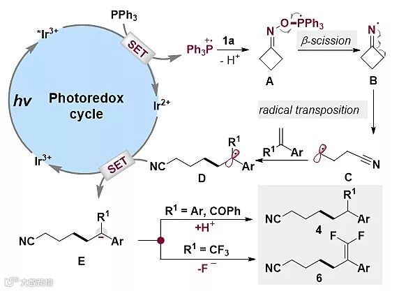 机理研究发现,在可见光照射下,激发态的催化剂Ir(dF(CF3)ppy)2(dtbbpy)]PF6[E1/2red (*IrIII/IrII) = +1.21 V vs SCE]首先将三苯基膦Ph3P (E1/2red = +0.98 V vs SCE)氧化为三苯基鏻自由基正离子。随后,三苯基鏻自由基正离子与环丁酮肟N-O键的氧原子结合,P-O键具有高键能,易于形成P=O双键和关键中间体B,其经历β裂解得到中间体C,中间体C可与不同自由基受体发生自由基加成反应。以普通芳香烯烃作为受体时,D中间体进一步还原得到产物4;当受体为三氟烯烃时,则会进一步发生β-氟裂解,得到偕二氟烯烃产物6。