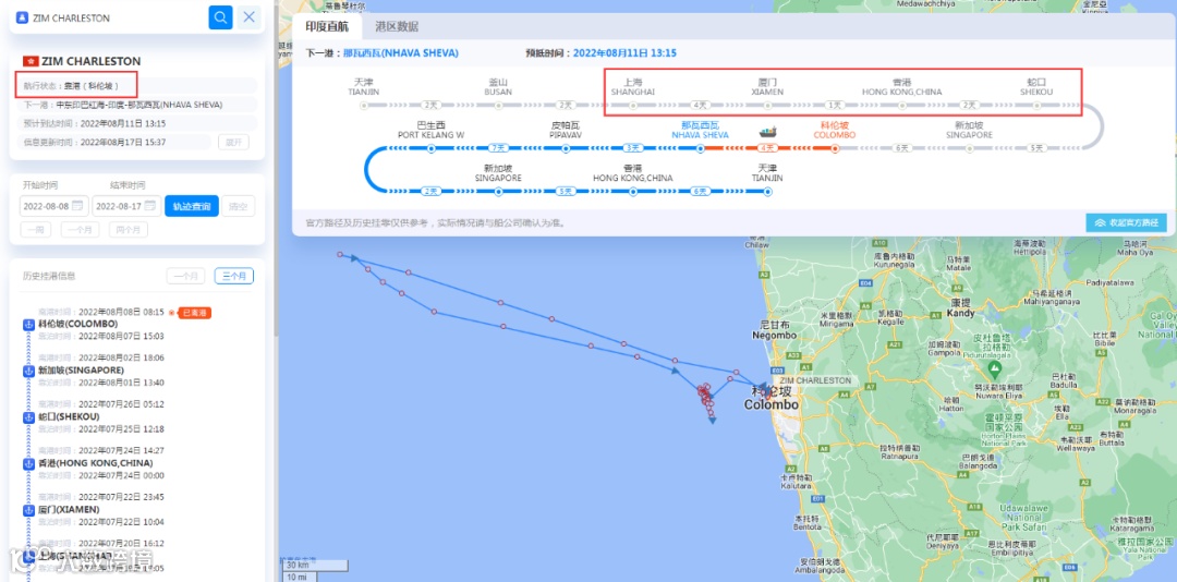 “ZIM CHARLESTON”离开科伦坡向西航行,于8月8日至9日折返并返回科伦坡于8月11日靠泊。