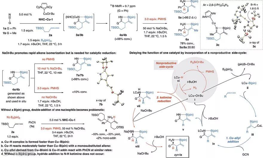 众所周知,多组分反应最大的挑战在于如何精确调控各子反应的顺序,这就要求研究人员要对反应机理有深刻的理解。作者对反应条件进行筛选。毫无疑问,第一步是联烯与Cu-NHC复合物形成的烯丙基-Cu复合物对腈的氰基加成形成亚胺中间体(iv)。研究人员也发现如果没有B2(Pin)2存在,由于失去了硼酸酯的位阻效应,新生成的亚胺还会再发生一次烯丙基化得到双加成产物8。其次,对亚胺的还原必须快于烯烃的异构化。碱对于形成Cu-H复合物(vi)和切断Cu-N键(v)非常关键,同时由于烯丙位的H具有较强的酸性,在强碱(如叔丁醇钠)作用下可能会发生双键异构化,因此需要采用相对温和的碱。最后,亚胺的还原是在硼酸酯的辅助下进行的,涉及C=N键与-B(pin)的螯合作用,因为非鳌合状态下的亚胺并不能被Cu-H复合物还原,由此也解释了非对映选择性的来源,负氢只能从螯合构成面的最小位阻处进攻。这其中还有个疑问:Cu-H复合物的生成速度远快于Cu-B(pin)物种,为何第一步反应依然能实现?
