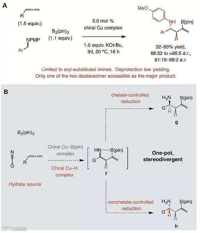 为了克服以上不足,近日美国波士顿学院的Amir H. Hoveyda教授课题组报道了以廉价易得的腈类出发,在Cu-氮杂卡宾复合物的作用下和联烯、联硼酸频哪醇酯(B2(Pin)2)形成烯丙基亚胺中间体f(图1B),随后可分别通过螯合机理或非螯合机理被聚甲基氢硅氧烷(PMHS)或硼氢化锂还原,最终得到两种光学纯度很高的高烯丙基伯胺g和h(图1B)。这种直接转化的“一锅法”发表在Science 上。腈类通常作为配体且相对惰性,在笔者印象中,这也是腈类化合物与碳基亲核试剂进行催化对映选择性反应的首次报道。