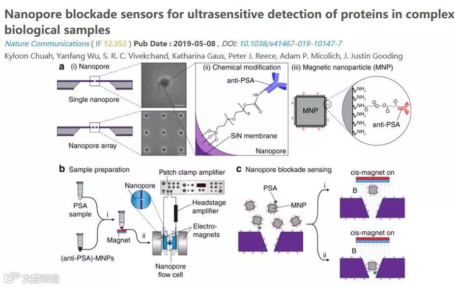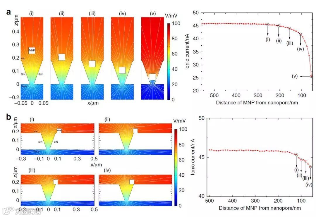 同样在Nature Communications上发表了一篇生物物质检测的论文,题为“纳米孔阻滞传感器用于复杂生物样品中蛋白质的超敏检测”。此论文中,作者使用了Comsol软件的三个模块,分别是AC/DC 模块去模拟静电效应,利用化学物质传输模块去模拟K+离子和Cl-离子的稀释物质传输,利用流体流动模块去模拟层流速度分布。这三个模块的结合用于模拟纳米孔内的例子电流密度,用于作为磁性纳米颗粒与纳米孔之间距离的函数。