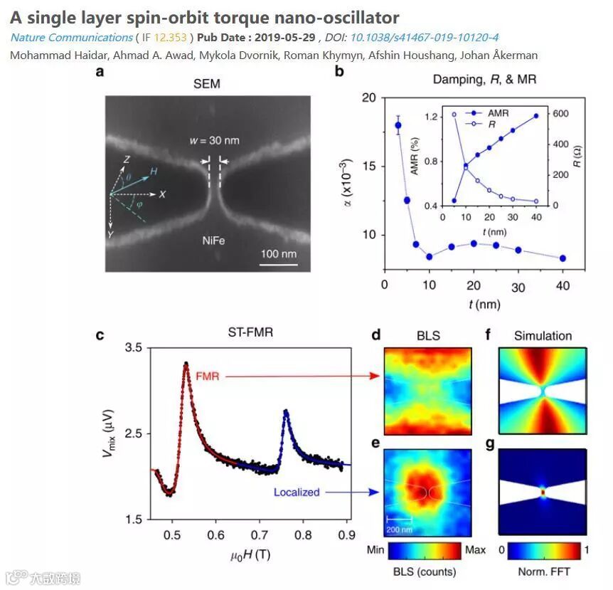 Nature Communications 上发表了一篇题为“单层自旋轨道扭矩纳米振荡器”,作者使用了Comsol的电磁模块来助力文献中的微磁学模拟。