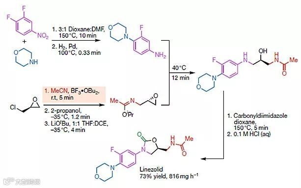 最近,麻省理工学院的流动化学“大牛”Timothy F. Jamison教授课题组,基于连续流动化学用创纪录的七步反应合成了抗生素利奈唑胺(Linezolid,商品名Zyvox),无需溶剂交换和中间体纯化。相关论文发表在Angew. Chem. Int. Ed. 上。