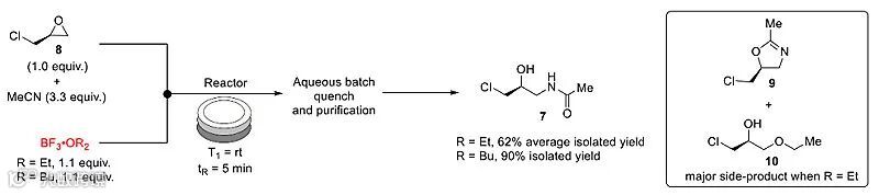 文中从制备酰胺7开始,(+)-环氧氯丙烷8和乙腈发生Ritter型反应。开始用三氟化硼乙醚作为化学计量的Lewis酸,室温下反应5 min,反应结束后用NaHCO3溶液淬灭,间歇式反应纯化得到7,平均收率62%。在这个反应条件下,副产物9的生成很大程度上被抑制,却生成了约15%的副产物10,说明乙醚作为亲核试剂参与了反应。对此,作者更换了位阻更大的三氟化硼丁醚,消除了副产物,同时收率提高至90%,图2所示。7的反应较为理想了,还有就是提纯,作者尝试使用T-型混合装置将水溶液淬灭步骤整合到连续流动装置体系中,但反应后的硼酸析出沉淀容易堵塞通道,换为异丙醇在-35 ℃下淬灭Lewis酸后生成了可溶性的硼酸酯副产物。在这个反应条件下,中间体腈鎓离子也会和异丙醇反应,生成亚氨酸酯12,并通过核磁氢谱得以验证。随后将12的流动相通入含有1:1比例的THF和1,2-二氯乙烷混合溶剂中,以叔丁醇锂为碱,反应温度-35 ℃,停留反应时间4 min,得到环氧化物13。其中1,2-二氯乙烷能够在低温下溶解反应生成的氯化锂。这样以(+)-环氧氯丙烷8为起始物料,反应时间仅为10.2 min,得到一个酰胺保护结构的环氧化合物13。值得注意的是,对反应器II和反应器III中的条件的变化,如异丙醇和叔丁醇锂的当量,甚至包括冷浴温度和滞留反应时间的变化,都会使氨基醇2的收率下降。另外,12中活泼胺基官能团的保护,也降低了在反应器III中合成环氧时的副产物的形成。