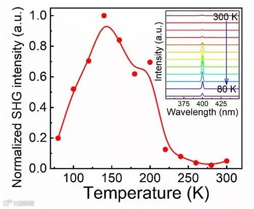 近日,北京大学黄富强课题组与中科院理化技术研究所姚吉勇课题组以及华中科技大学翟天佑课题组合作,从晶体结构设计出发,将高度极化的Sb/O/S基团作为功能基元,开发出一种新型强响应红外非线性光学晶体Sr6Cd2Sb6O7S10。该材料在2.09 μm激光照射下,可以实现高强度倍频信号(SHG)输出,是同等条件下AgGaS2的4倍,这是目前已报道的氧硫化物非线性材料中的最高值。该材料具有相位匹配的特性,因此具有潜在的实际应用价值。此外,基于单晶的变温倍频测试表明,降温可以显著提升倍频响应强度,达到室温下的20倍,为进一步提高输出强度提供便利手段。理论计算表明,材料的非线性响应主要来源于高度极化的SbOS4基团,验证了晶体结构设计的有效性。本研究为探索高性能的新型红外非线性光学晶体提供了新的设计思路。