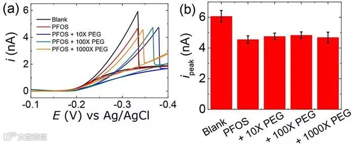 图5. 通过在PFOS溶液中添加PEG证明该电化学检测表面活性剂的选择性。图片来源:Anal. Chem.