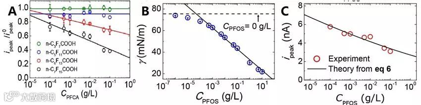 图3. 在铂纳米电极表面不同浓度的PEOA和PFOS对应的峰电流以及它们的关系。图片来源:Anal. Chem.
