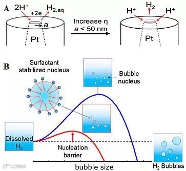 根据经典气泡成核理论,在气泡形成过程中由于形成气液界面时存在的能垒需要溶液中溶解的气体达到过饱和状态(图2,蓝线)。而在表面活性剂分子存在时,气液界面的表面张力降低,有助于稳定气核,从而降低气泡成核所需溶解气体的过饱和程度。作者希望基于该原理将气泡成核所需过饱和程度的变化转化为电化学信号,以实现表面活性剂的高灵敏度和特异性检测。基于之前的工作(Langmuir, 2013, 29, 11169)(图2A),作者发现表面活性剂具有很高的表面活性,在溶液中氢气的浓度很低时就可以使气泡成核。在铂纳米盘电极上能够通过扩散受限电流的下降来监测铂/气/液界面处电还原单个氢气气泡的生成。在电位扫描过程中,在气泡成核时电流快速降低,出现电流峰值。作者考虑通过检测该电流峰值以实现水中表面活性剂的定量检测。