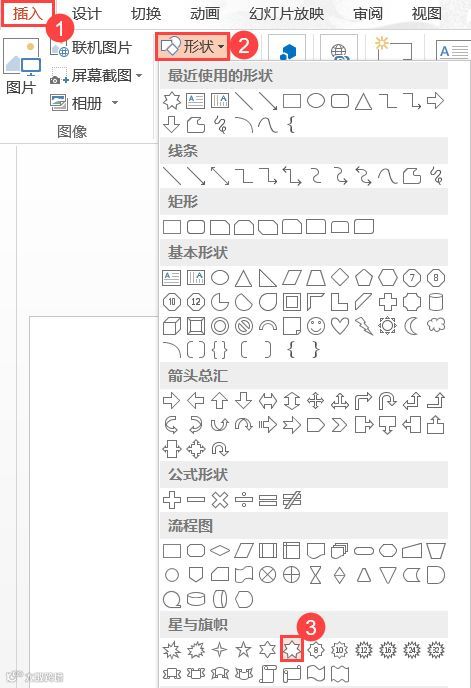 1. 打开PPT,在菜单栏单击“插入”,单击“形状”,找到“七角星”图案;