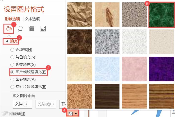 2. 弹出关于设置形状格式的窗口,在“填充线条”下的“填充”中点选“图片或纹理填充”,将“纹理”中的图案换成“绿色大理石”图案