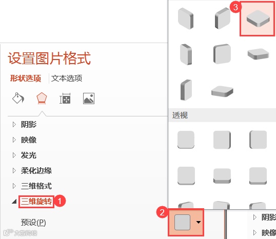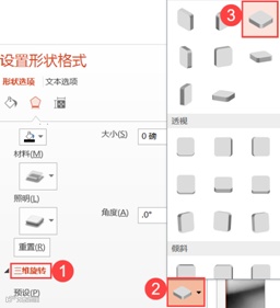 2. 将“三维旋转”中的“预设”设置为“等长顶部朝上”