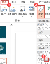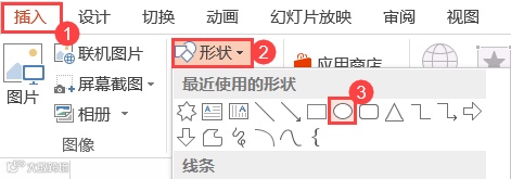 1. 在菜单栏单击“插入”,单击“形状”,找到“椭圆”图案