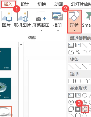 1. 在菜单栏单击“插入”,单击“形状”,找到“同心圆”图案
