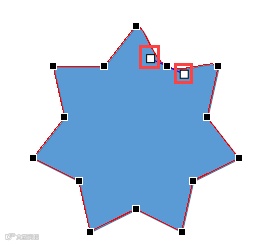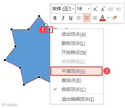 4. 之后“七角星”图形上的所有顶点都会变成黑色方点,表示可供编辑,在内凹的顶点上单击鼠标右键,在弹出的菜单中选中“平滑顶点”,这样顶点会变成平滑的状态。