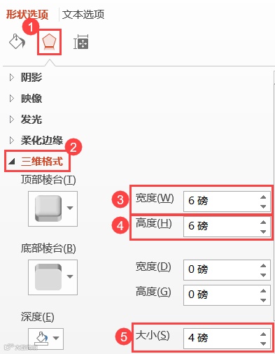 5. 选中同心圆,单击“效果”中的“三维格式”,将“顶部棱台”的“宽度”和“高度”都设置为6,“深度”设置为4
