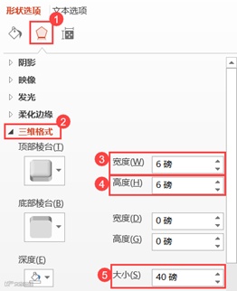 5. 选中同心圆,单击“效果”中的“三维格式”,将“顶部棱台”的“宽度”和“高度”都设置为6,“深度”设置为40