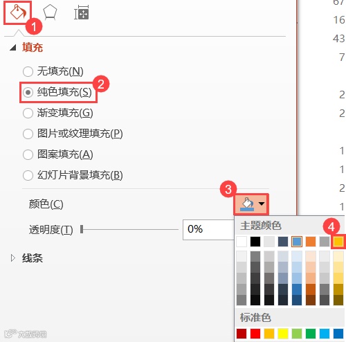 4. 弹出关于设置形状格式的窗口,在“填充线条”下的“填充”中点选“纯色填充”,将“颜色”换成“金黄”