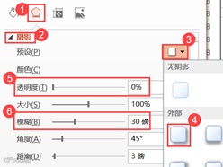 3. 单击“效果”中的“阴影”,将“预设”设置为“右下斜便宜”,将“透明度”降为0,将“模糊”设置为30