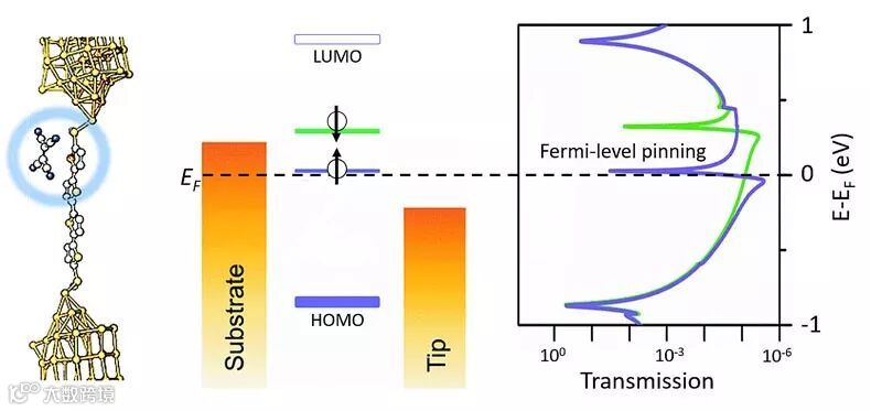 近日,美国佐治亚大学的徐炳乾课题组与英国利物浦大学的Simon Higgins课题组利用电子转移配合物实现了费米能级的钉扎效应(Fermi level pinning effect),从而观察到单分子电导对分子长度及电极耦合的弱依赖性及有效的长程电子传输。