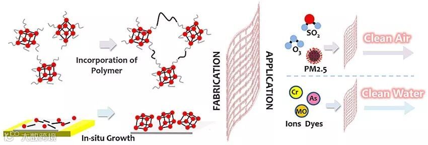 该综述介绍了两种MOF膜的合成策略,即合成后与聚合物复合成膜以及基底上原位成膜策略,并据此总结了几种MOF成膜化工艺,重点介绍了王博教授课题组开发的原位交叉编织法(in situ interweaving)、合成后聚合(postsynthetic polymerization,PSP)和无溶剂热压(solvent-free hot-pressing, Hop)。原位交叉编织技术通过在MOF纳米晶粒之间原位引入高分子单体,进行自聚合,从而使MOF颗粒之间通过功能高分子链连接,实现快速均匀成膜。在原位聚合交叉编织法基础上,为了进一步增强高分子链与MOF晶粒表面的化学相互作用,提高MOF膜的化学稳定性,王博教授课题组提出为MOF晶体颗粒进行合成后聚合,通过引入合适的单体和光引发剂,使用简便的光引发聚合,完成对MOF的稳定化学键连接,制备高选择性的无基底MOF薄膜。针对前两种方法的局限性,进一步提出从分子层面实现MOF膜的层层自组装,通过连续热压原位成膜,设计调控金属和有机物与基底表面官能团的反应性,实现在基底表面的快速成键,最终解决MOF颗粒均一度和MOF膜与基底之间稳定连接的问题。鉴于MOF材料作为吸附剂以及催化剂在环境净化方面的重要应用潜力,该综述还介绍了MOF膜作为滤膜对PM颗粒、二氧化硫、臭氧等空气污染物以及有毒金属离子、有机染料等水体污染物的去除研究。