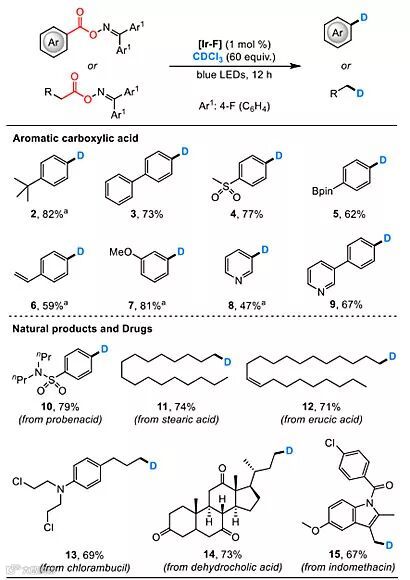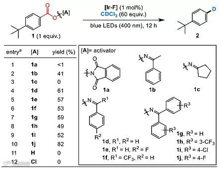 在这里,Ir(dF(CF3)ppy)2(dtbbpy)]PF6由于其长的激发态寿命(τ = 2.3 μs)和高的三线态能量(60.8 kcal mol-1)被作为光敏剂(催化剂),而N-O键解离能只有~45 kcal mol-1。作者选取了12种芳基羧酸衍生物(其中图2中entry 11为羧酸),选取脱羧氘代作为模板反应,因为氘代标记的产物在新药研发中的疾病诊断和药物工业化中占据重要地位。为了选出更高活性的芳基自由基,氘原子就选用了最常用和便宜的氘代试剂如氘代氯仿,通过这些羧酸衍生物的脱羧实现其氘代的反应。根据结果的对比,最后发现取代基为1j时候,收率最高。