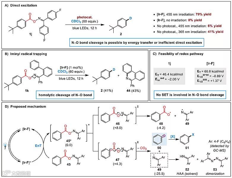 最后,作者探讨了反应的机理。首先,作者通过Stern-Volmer磷光淬灭实验即1j对光催化剂激发态[Ir-F]*的磷光淬灭,证实发生了激发三线态的振动跃迁。其次,作者探讨了该反应进行EnT机理的可行性。一方面,三线态过程的反应可以直接被光激发,这区别于单线态机理。作者确实观测到,使用365 nm的LED灯照射,可以产生同样的产物2,只不过产率稍低。另一方面,EnT实验过程应该同时产生N-中心亚胺自由基50和芳基自由基。作者通过分子内捕捉得到产物45,证实形成了亚胺自由基,且产率和脱羧产物2相当。再次,作者探讨了该反应进行SET机理的可行性。作者考察了1j的电化学参数,1j的不可逆还原电势为-2.0 V(vs SCE in DMF),这排除了通过IrIII*或IrII的SET还原过程。而与此相反的是,比较1j的计算三线态能量数据与[Ir-F]*的三线态能量,进一步证实了[Ir-F]*到1j的三线态能量转移的热力学可行性。