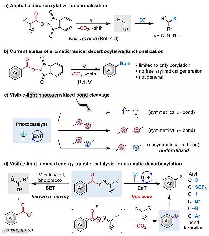 芳基羧基脱羧难以进行主要原因是其动力学稳定性,脱羧反应的速率常数(芳羧基vs烷羧基:~105 s-1 vs ~109 s-1),因此,与烷羧基相比芳羧基的脱羧反应仍然是一个巨大的挑战。最近,Frank Glorius课题组在可见光的条件下,通过能量转移(Energy Transfer, EnT)的方式实现了芳基/烷基羧酸衍生物的脱羧官能团化(图1d),该文章发表于Angew. Chem. Int. Ed.。
