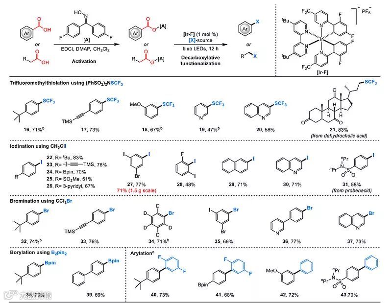 除了脱羧氘代,作者也对底物进行了脱羧之后的其它取代反应。比如利用(PhSO2)2NSCF3作为弱亲核性芳基自由基的捕获剂,实现了脱羧硫三氟甲基化,在这里作者选取了五个芳基羧酸和一个复杂的烷基羧酸作为代表性的例子;此外,作者分别利用氯碘甲烷和溴仿作为碘和溴源,通过脱羧得到碘代和溴代的产物;最后通过该方法得到的芳基自由基也能被硼酯和芳烃所捕获,可得到相应的硼烷和芳基化产物。