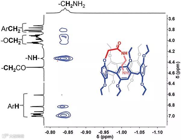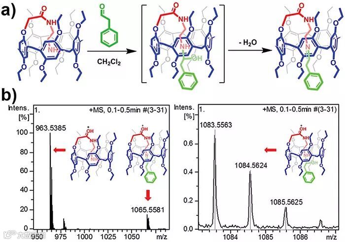A:如上所述,我们的研究兴趣是稳定活泼的脂肪半缩醛胺中间体。众所周知,脂肪醛与脂肪胺形成的半缩醛胺很难通过质谱的方法进行检测。我们的目标很简单,就是设计合成空腔深度合适的大环合成受体,使半缩醛胺的形成能在空腔内进行,一方面有效避免溶剂效应对正向反应的影响,另一方面有效控制逆向反应过程,从而增长半缩醛胺的寿命,进而利用质谱进行原位分析。因此,该受体分子必须满足:a) 具有处于空腔内部的活性识别位点,比如氨基;b) 具有选择性分子识别能力。幸运的是,在研究全乙氧基柱[5]芳烃对混合醛(苯甲醛,2-甲基丁醛和正己醛)与茴香胺反应的影响时,我们发现乙氧基柱[5]芳烃对正己醛表现出很好的选择性识别,具有相对较高的键合常数,因而只有正己醛不能与茴香胺反应。受此启发,我们合成了如上单臂末端氨基功能化柱[5]芳烃。利用该功能化分子与混合醛反应,我们发现只有正己醛可以与单臂末端氨基功能化柱[5]芳烃反应。经过深入研究发现,单臂末端氨基功能化柱[5]芳烃就是一个理想的受体模型。