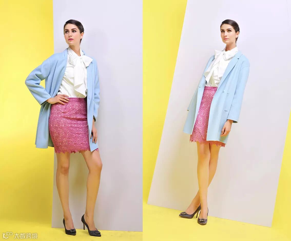 粉蓝色羊毛大衣是经典的小西装款,简洁的剪裁体现女性的中性气质,丰富的色彩更能充分突显时尚魅力,配白色上衣和蕾丝半裙彰显知性利落感,而甜美的马卡龙色增添女性柔美气息。