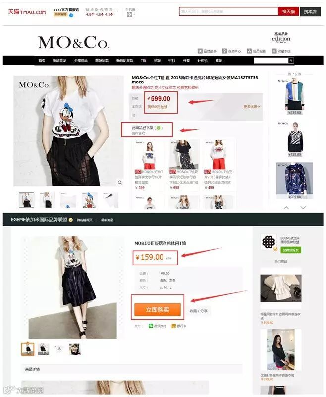小编默默的标注了俩个红框框,一个是天猫正品价599元,还给卖完了!不卖了!一个是只买159元,而且立即购买!这一刻,你还在犹豫么?担心我们的不是MO&CO正版???