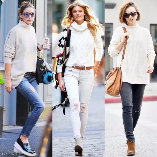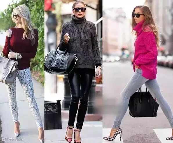 毛衣搭配紧身裤,真的是显瘦最好的搭配!除了牛仔裤,黑色裤装搭配,搭配阔脚裤也是不错的选择。