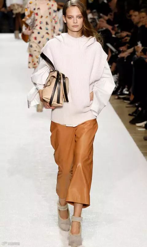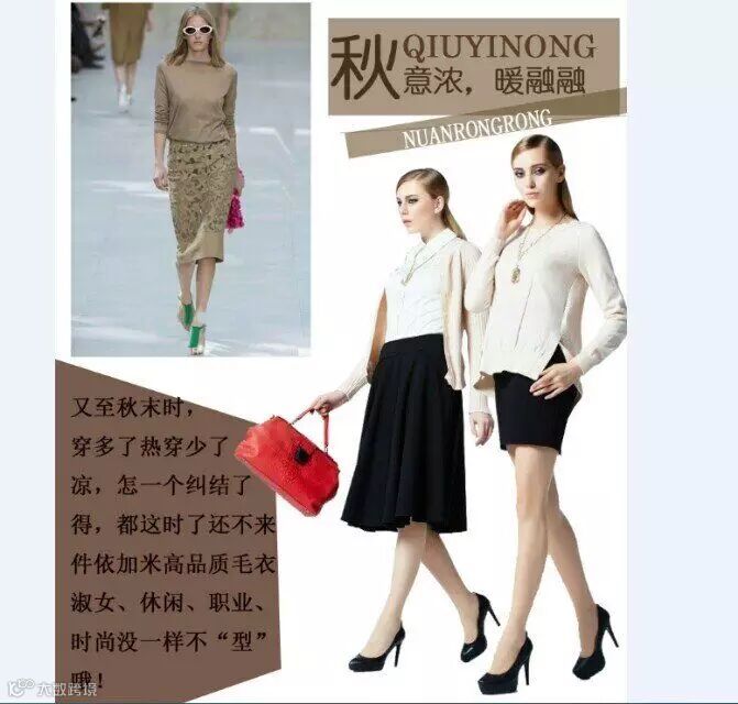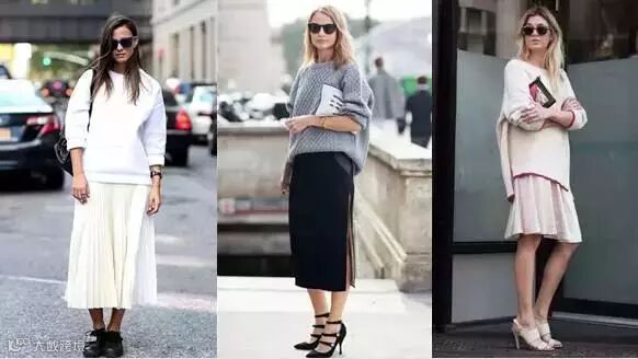 是在夏秋过渡街拍中常能见到的套路之一,用短款的毛衣+显高的长裙,显高又显瘦。
