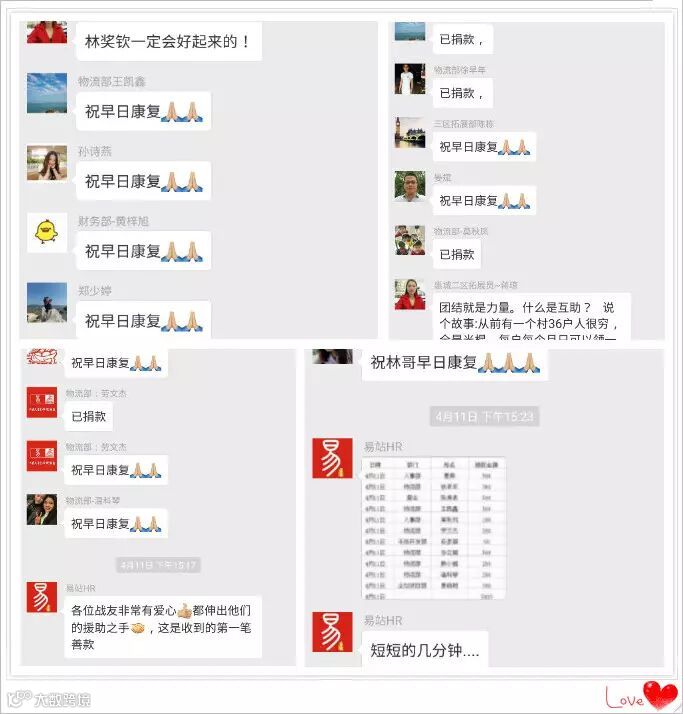 林奖钦此前任职易站物流部办公室事务组长,长期以来对本职工作兢兢业业,勤恳务实,追求上进,乐于帮助同事,是易站人心中的一位好站友。在募捐过程中,每一天,站友们都通过公司微信群密切关注林奖钦的治疗进度和身体状况,并发出一个个祈愿和祝福。