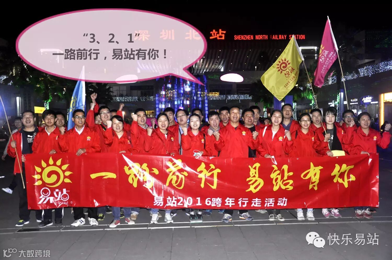 在深圳北站,易站旗帜迎风飘荡,一朵朵红色的喜艳点缀着北站节日盛装、一张张激情面孔吸引了一个又一个羡慕和赞赏的目光,特别是2015年12月31日23时57分,随着易站人“3”、 “2”、“1”整齐而洪亮倒计时呐喊声响起,周边人也深受感染,融入其中,一起欢呼着迎接2016的降临!这就是易站正能量传播的力量!