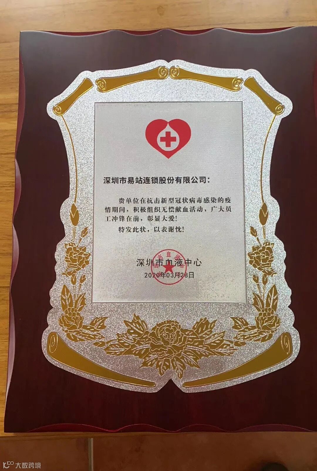 在得知站友们如此积极热情的参与献血后,深圳市血液中心特地向易站连锁颁布了感谢牌。