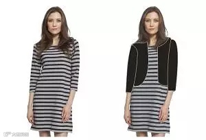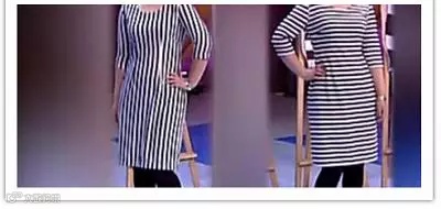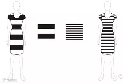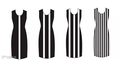 图中两条连衣裙,都是由同一个人穿着的。你觉得到底是横条纹显胖,还是竖条纹显胖呢?请仔细观察,尤其是模特的肩部、胸部和腰部。相信大家都有结论了。
