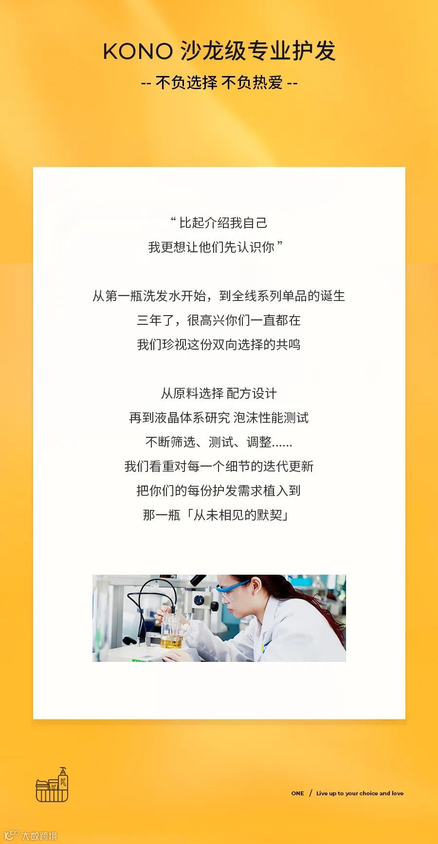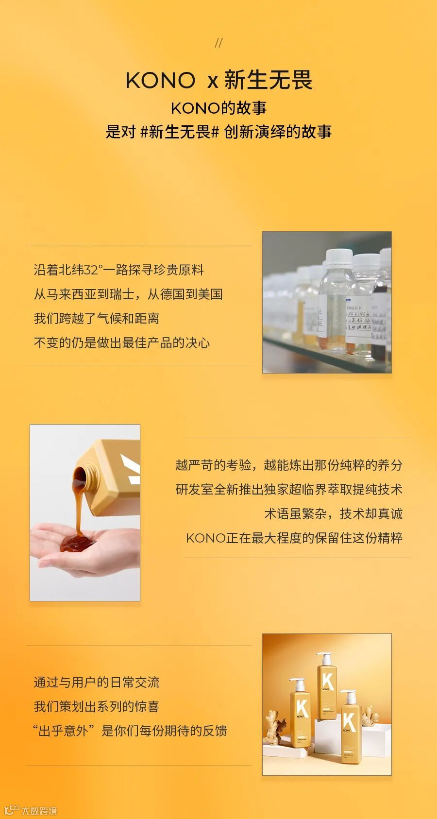 KONO是一个专业护发品牌。始终坚持以满足用户对护发的极致追求为导向,从全球引进原料及先进技术,用专业护发沙龙的标准进行产品研发,精研功效护发产品,让每个人随时都能享受沙龙级的护发体验。