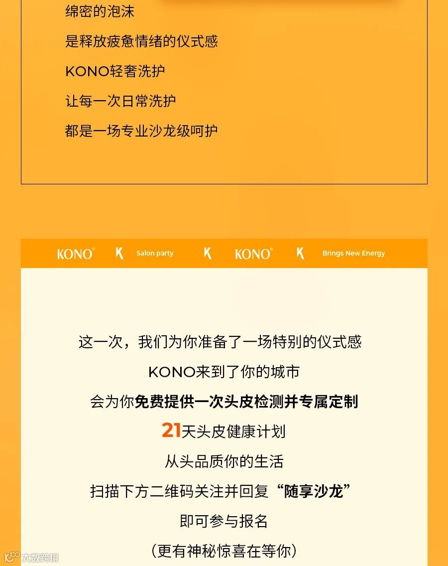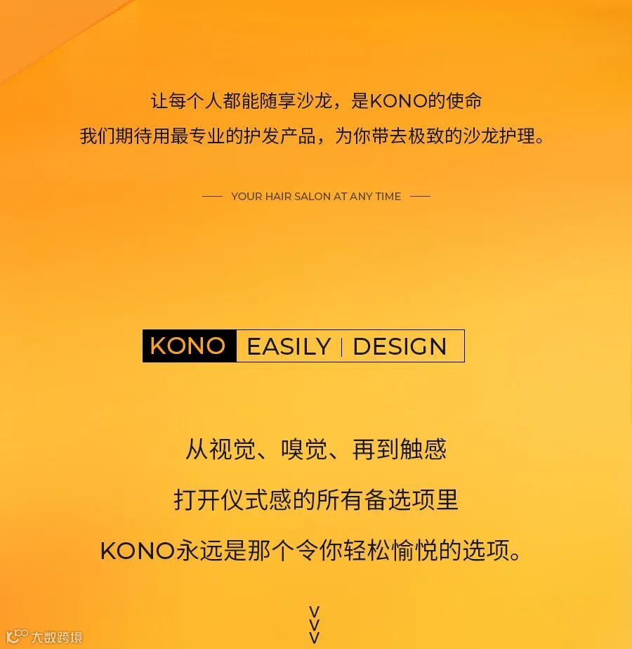 KONO是一个专业护发品牌。始终坚持以满足用户对护发的极致追求为导向,从全球引进原料及先进技术,用专业护发沙龙的标准进行产品研发,精研功效护发产品,让每个人随时都能享受沙龙级的护发体验。