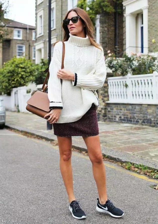 呢子裙适合配厚一点的衣服,如果天气转凉可以加一双打底裤袜,配上运动鞋休闲又精致。