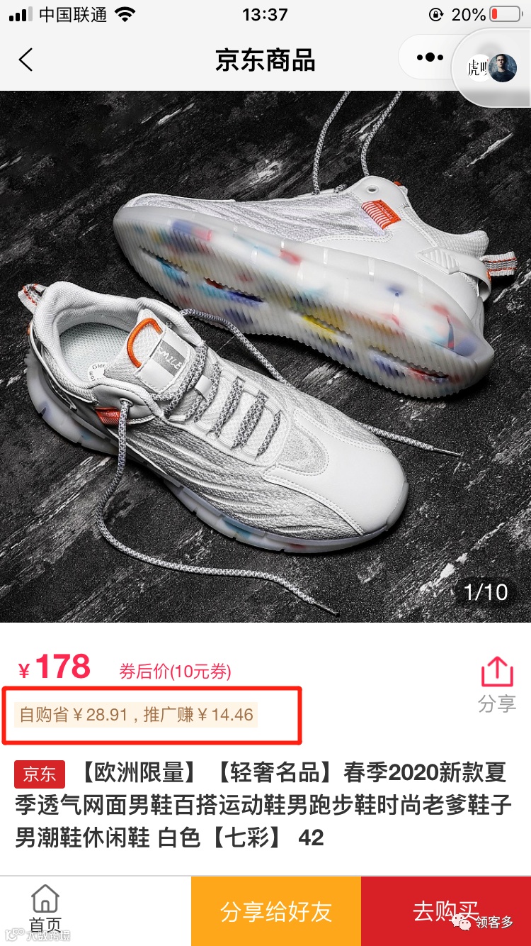结合上下图,我们可以看到,同样的一款鞋,我们在多领客小程序里面购买,不仅可以享受到在京东官网APP里一样的优惠活动。同时,在此基础上,我们还可以享受到接近30块钱的返佣!!